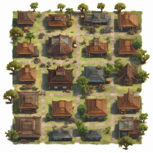sprite sheet, game asset, 2d top view, drone view, Ancient Sukhothai traditional village, only the roof visible, stylize handraw ilustration