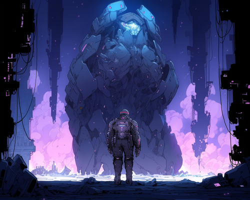 lone survivor of an ancient but highly advanced civilization, standing next to a monolithic spaceship, robotic, cyberpunk, my hero academia art style, rough edged 2d animation --niji 5 --ar 5:4