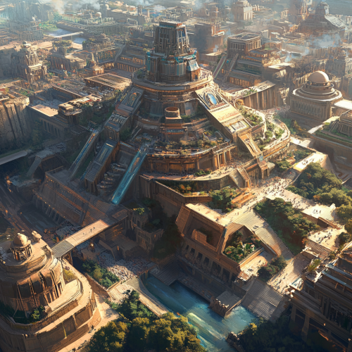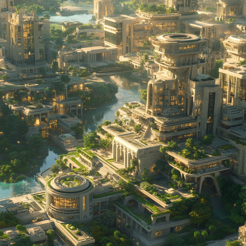 Imagine a sprawling modern city where sleek glass buildings rise alongside structures inspired by the ancient Indus Valley Civilization. Towering, stepped platforms resemble the great granaries and citadels of Mohenjo-daro, now reimagined as futuristic towers of stone and steel, adorned with intricate geometric patterns. Large public baths and water systems, a nod to the civilization’s advanced urban planning, are integrated seamlessly into the city's design, surrounded by lush gardens and modern plazas. The city's layout mirrors the ancient grid system, with broad avenues and precise, organized blocks. Streets are lined with sculptures and carvings that reflect the civilization’s artistry, while natural elements like rivers and greenery flow harmoniously with the clean lines of modern architecture. Photorealistic, shot on a Nikon camera, the scene is full of vibrant detail and light, illustrating the seamless blend of ancient wisdom and modern progress. In the style of da vinci --v 6.1
