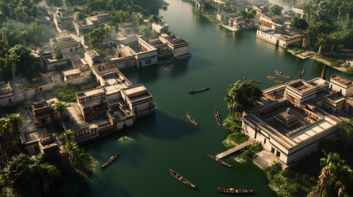 A vast and fertile landscape between two majestic rivers, the Tigris and Euphrates, with golden sunlight reflecting off the waters. In the distance, an ancient city rises with towering mudbrick walls and a grand ziggurat in the center, stretching toward the sky. Lush green fields of wheat and barley sway gently in the breeze. Farmers near the riverbanks operate simple irrigation systems, guiding water to the rich farmlands. Merchants unload goods from small boats, while artisans work in brick kilns and craft stone tools. The city streets are filled with bustling markets, vibrant with traders and donkeys carrying goods. Above, faint symbols of cuneiform writing float, alongside the outline of ancient law tablets, representing the earliest systems of writing and law. Soft morning light creates a mystical glow over the ancient world, with the sky transitioning from gold to light blue, capturing the dawn of civilization. The atmosphere is warm, inviting, and filled with the energy of a rising civilization --ar 16:9