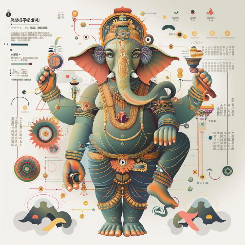 handsome,The shape of an ancient Ganesh deity,An infographic or diagram showing Ganesh position and influence in the development of ancient Indian civilization, connecting the Mahabharatha, the philosophy of Dharma and Karma, and the cultural development of later generations with lines or arrows, visually presenting Ganesh's contribution to Chinese civilization.Indian mythological story characters,Character illustration by Feng Zhu and Yoshitaka Amano,Chinese prints, Indian mythological story characters, standing in the clouds and mist, Chinese style colorful colors, flat color illustration,hyperrealistic. --v 6.0