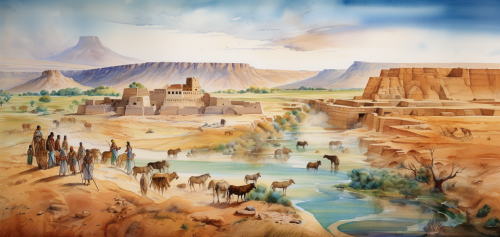 in the form of watercolour illustration, map of Indus Valley Civilization, a big river on the map, mud walls, horsemen with families coming down the grasslands, blue sky, depth of field, --ar 19:09