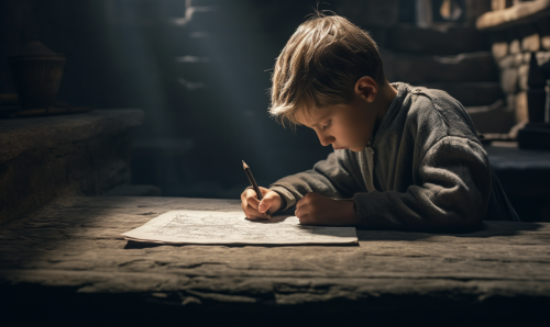 ancient child in ancient classroom at some kind of an ancient table pressing hard with a stylus on a parchment to copy the aphabet or letters of his teacher, who is writing with charcoal on the wall realistic, cinematic, 4k --ar 5:3