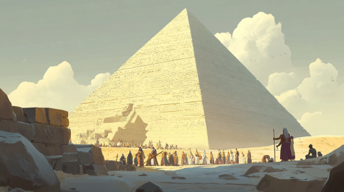 A young Pharaoh Khufu stands confidently at the construction site of the pyramid, adorned in a luxurious ancient Egyptian royal robe, with golden jewelry glimmering in the sunlight. He wears a proud smile, his eyes filled with dreams for the future. Around him, skilled workers bustle, transporting massive stones and carving with precision. In the background, the outline of the pyramid rises majestically, bathed in warm sunlight. The sky is a deep blue, dotted with birds soaring above, symbolizing freedom and hope. The color palette features bright golds and blues, with Khufu's robe in vivid reds and blues, contrasting against the simple earth tones of the workers' attire, highlighting his youthful power and leadership. --v 5.1 --ar 16:9 --style raw