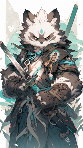 Japanese raccoon dog warrior, pencil art, line art, light brown fur, illustration, minimalism, cyan and pink accents, fantasy, glowing eyes, white background --ar 9:16 --s 750 --niji 5