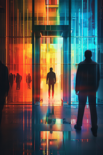 A conceptual image of a bright, glass office building where diverse figures enter through open doors. Outside the building, a lone figure stands, blocked by an invisible force field. The figures inside are glowing with vibrant light, while the figure outside remains in shadow, highlighting the unseen barrier between the promises of inclusion and the reality of exclusion. Created Using: surreal symbolism, modern architecture, transparent barriers, strong light contrasts, subtle detail, hd quality, vivid style --ar 2:3 --v 6.0