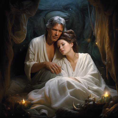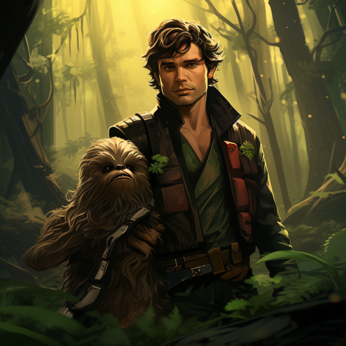 han solo and baby yoda on endor, ewoks in the background. comicstyle