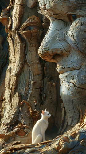 Image Prompt: A wise ancient Tree Guardian, bark like stone, eyes like stars, towering presence, serene demeanor. In a hidden glade: surrounded by ancient trees, dappled sunlight filtering through leaves, a sense of timeless wisdom. The scene is tranquil and awe-inspiring.
