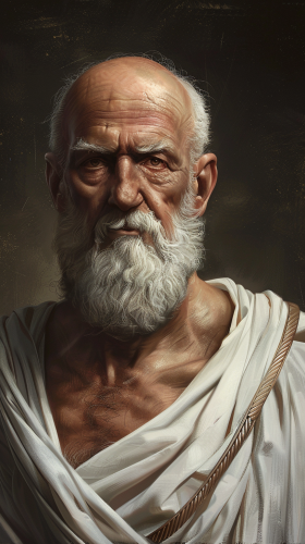 a middle-aged man with a calm, composed demeanor. He wears glasses, suggesting wisdom and thoughtfulness. His modest, unassuming appearance reflects his humble and moral nature, and his gentle, yet firm, gaze conveys his deep sense of justice and integrity.