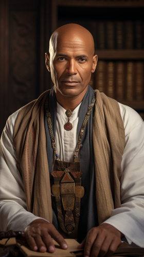 Photography of Handsome Imhotep, Ancient Egyptian descent, wise, thoughtful demeanor, dark brown eyes, intelligence, innovation, bald head, warm brown skin, slender, upright posture, white kilt, ceremonial jewelry, holding papyrus scrolls, renowned polymath, architect, physician, Nikon D850 with a 50mm f/1.4 lens, --ar 9:16 --s 200