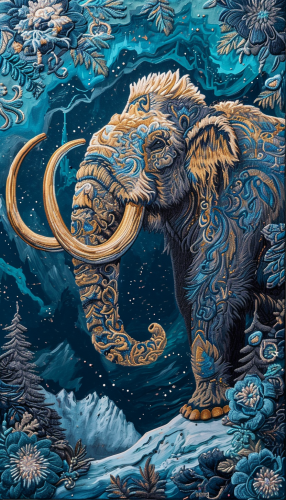 Autumn Tundra, Mammoth Herd and Falling Leaves, Colored Pencils, 3D Embroidered pattern --ar 4:7 --v 6.0