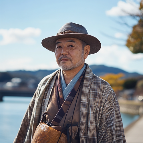 Realistic photo. The man wearing a loose-fitting jacket is a middle-aged Japanese man who wears a light brown hat with white lines. He is wearing a brown checkered jacket, and one hand is sticking out from inside the jacket. Underneath the jacket, he wears a light blue long-sleeved jacket with a wide open neck, and a dark brown belly wrap around his stomach. In one hand, he is holding a brown square bag. She is walking under the blue sky, facing forward, with a black string amulet hanging around her neck. The man is walking along the bank along the river. The camera shows the surroundings and the man.