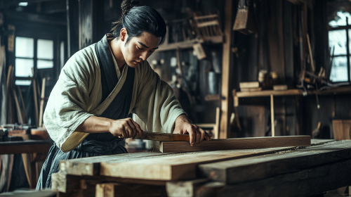 A young Japanese poverty man of 19th century, wearing Japanese men's traditional clothing, sawing on a lumber in a furniture workshop, with an expression of concentration, Henri Cartier-Bresson photography style, high contrast, color, Kodak tone, 8k --ar 16:9