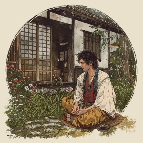 Mobius style, medieval Kyoto, young merchant man, --ar 3:4