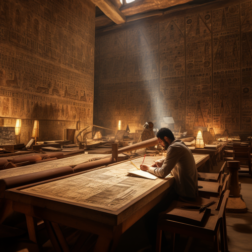 An ancient scholarly room or library in Uruk, showcasing the profound significance of cuneiform writing beyond mere record-keeping. In the center, several scholars and priests gather around a large table filled with clay tablets inscribed with wedge-shaped symbols, discussing various topics such as laws, history, and poetry. On the left, a visual evolution of cuneiform writing is displayed, transitioning from simple symbols to complex characters, alongside representations of Egyptian hieroglyphs, Phoenician alphabet, and ancient Greek letters, illustrating their connection to cuneiform. On the right, an elderly priest teaches a group of attentive young students, with a clay tablet depicting an ancient event, emphasizing the preservation of history through writing. Sunlight streams through the window, illuminating the space and creating soft shadows, enhancing the atmosphere of scholarly pursuit. Details include various writing tools, intricate decorations on the walls symbolizing knowledge, and small animals resting in the corners, adding vibrancy and life to the scene --ar 16:9