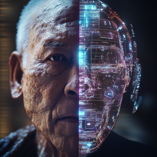 a split-image of a face of a ancient man, being uncultured and undeveloped on the left, and a superhuman being, looking like a robot-ai-etherial-holographic-cyborg on the other half of the split-image, frongal portrait, shot on Sony A7RV, shot with a 50mm Sony 1.4 GM lens