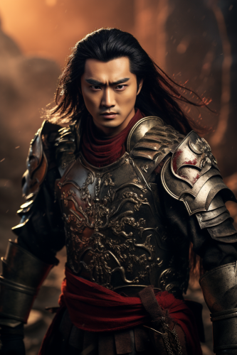 In ancient China, a handsome young general stood in front of the city gate, with the city wall and thousands of troops waiting to set out in the background, --v 5.0 --ar 2:3