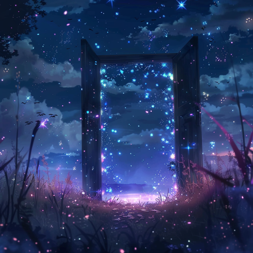 a brunette man with wind in his hair, looking over the beach, arms open, head up, constellations and stars falling through his fingers, spinning glass and streaks of light