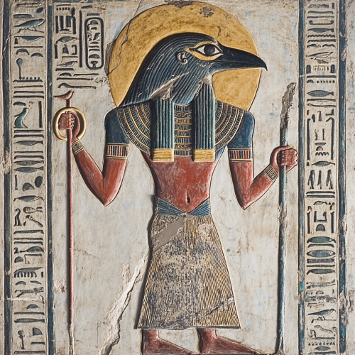 a depiction of ancient egyptian god RA, with giant wings and sun radiating from its body. dramatic --s 250