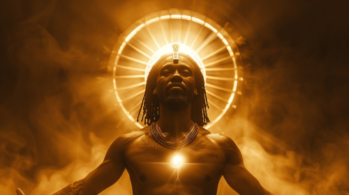 A combination of Christ and Ra with great musculature, the sun shining behind him, an eye of Ra around his neck and a halo about his head. --ar 16:9 --v 6.0