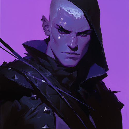 portrait of a shadowy drow male with ancient runic quartz facial tattoos and wearing a rogues black medieval leather coat and hood, grey drow skin, buzz cut white hair, young adult male, dark purple gouache background, gouache background, cinematic lighting, influenced by Alex Ross artwork style, Magic the Gathering artwork style, oil painting, Studio Ghibli artwork style, Eiichiro Oda artwork style, anime artwork style, anime, cinematic, HD, 8K, --niji 6