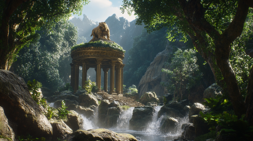power rangers commander center, but it's a roman temple with a jaguar statue on top in the middle of the jungle. thundercats. unreal engine. ultrarealistic. color grading. --ar 16:9