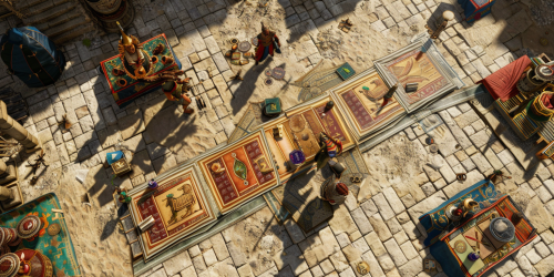 a drone shot of 2 players playing a board game. Egyptian VS Roman. They are dressed like their team. One is playing in a egyptian side (sand, pyramids, ra). The other is playing on a roman side (cesar, armord, like asterix). --ar 2:1 --style raw --v 6.0