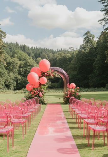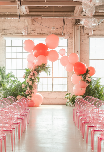 A modern, minimal wedding ceremony decor featuring an aisle lined with bright pink balloons, large maroon translucent plexiglass shapes, and ferns in an old warehouse. Maroon, translucent Panton designer chairs are organized in rows on both sides of the aisle , facing an arch decorated with large round balloons placed in front of a large window. Bright natural lighting --ar 11:16 --p 64hnt4i