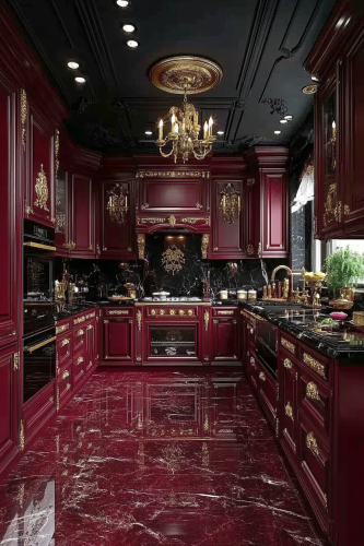 Capture an image of a regal kitchen with Maroon Majesty red kitchen cabinets, featuring a rich maroon color that exudes sophistication. Complement these cabinets with dark granite countertops and a matching deep burgundy backsplash for a cohesive, elegant look. The floor should be a luxurious dark wood, adding to the regal theme. Opulent gold hardware and ornate light fixtures can complete the majestic setting. This kitchen should appear luxurious and dignified, suitable for those who appreciate a refined aesthetic. Neat and organized. Camera: DSLR - Canon EOS 5D Mark IV. Lens: Canon EF 24-70mm f/2.8L II USM. Composition: Wide shot, room-centered, horizontal orientation, balance between furniture and space. Film: Digital, high resolution, color profile sRGB. Camera settings: ISO 400, f/2.8, 1/60 sec. --ar 2:3 --v 6.1 --s 250