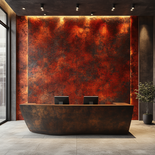 RECEPTION DESK FOR TWO PEOPLE IN THE ENTRANCE FOR HEADQUARTERS BUILDING, ORGANIC MODERN STYLE, BEHIND THE RECEPTION DESK THERE IS A TEXTURED DESIGNED WALL WITH ONE HIDDEN DOOR AT THE BEGINNING AND ONE HIDDEN DOOR AT THE END , INTERIOR, VERY luxurious DESIGN, THE RECEPTION DESK MUST BE CLOSED FROM THE TWO SIDES, THE USERS FOR THE BUILDING ARE HIGH-END INVESTORS, ADD TOUCH OF MAROON COLOR --s 750