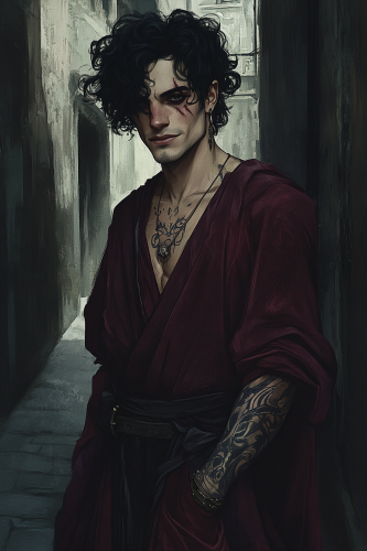 dnd portrait, an illustration of a dashing and mysterious young man with black curly hair and and a 5 o'clock shadow. He is wearing a maroon dnd style clothing and covering his body are black tattoos with an influence of dark magic in their design. He stands in an alley way. In the style of league of legends --ar 2:3