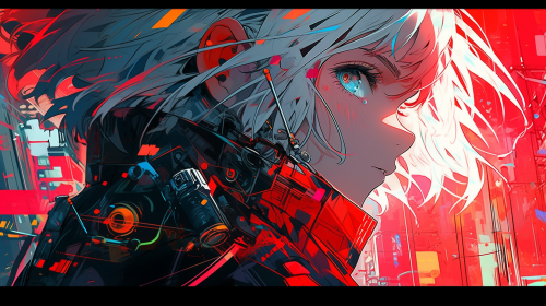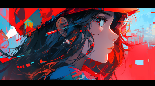 An image of anime girl looking at it and ‘on top of the world’, in the style of cyberpunk futurism, bright red background, light cyan, edgy street art, bold, colorful portraits, use of screen tones, dark proportions, synthwave, modular, --ar 16:9 --niji 5