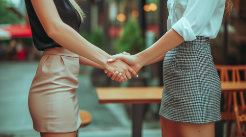 two business woman shaking hands at a table while wearing a skirt, in the style of light maroon and azure, interactive experiences, smilecore, futurist claims, soft-focus portraits, smooth and curved lines, eye-catching --ar 16:9 --v 6.0