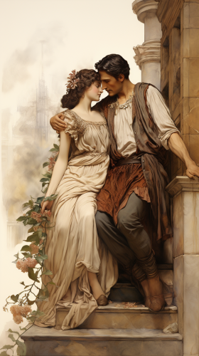 2th century. funny illustration. in ancient rome a couple giving a romantic kiss. --ar 9:16 --s 250
