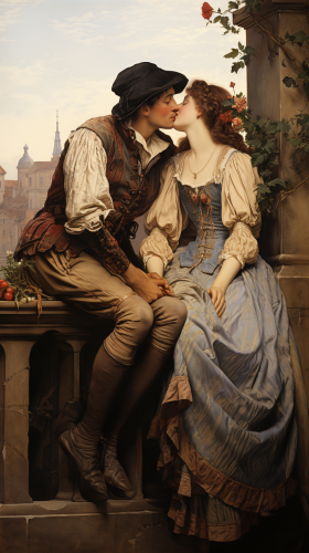 17th century. funny illustration. in ancient rome a couple giving a romantic kiss. --ar 9:16 --s 250