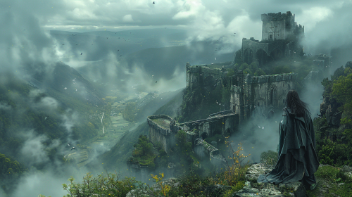 Ruins of an ancient fortress perched high in the mountains, overgrown with wild vegetation, broken walls and towers partially collapsed, clouds swirling around the peaks, mist covering the valley below, the remains of an old battlefield, eerie and desolate atmosphere, long-forgotten and haunted by the past, cinematic, high-resolution, 8K, UHD --s 750 --style raw --v 6.0 --ar 16:9