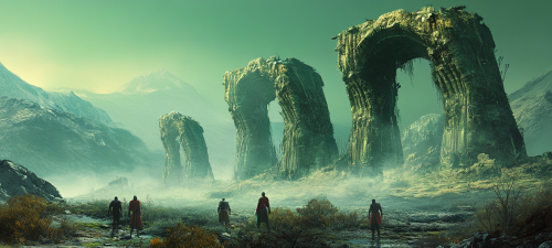 Wideshot of alien ruins that was once advanced but now decayed and covered in shrubbery on the edge of an alien jungle with strange plants. Sky is greenish blue with rugged mountains on the horizon. --ar 20:9 --style raw