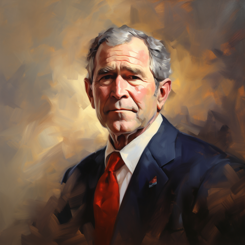 portrait of George W Bush. The artwork should be influenced by the styles of John Trumbull, Frank Bramley, Pompeo Batoni, Anthony van Dyck, N.C. Wyeth, Thomas Lawrence, and Ray Donley. Embrace the techniques of uhd imaging, solarization effect, representational art, and restrained expressionism. The color palette should predominantly feature navy, brown, dark yellow, light crimson, light red, and frequent touches of yellow. Integrate elements of classic Americana, photobash, icepunk, and rangercore for a harmonious blend. The atmosphere should exude a cold and detached feel, yet maintain a sense of iconic reverence. Aim for a resolution that captures the detail and depth reminiscent of 8k to 32k uhd quality