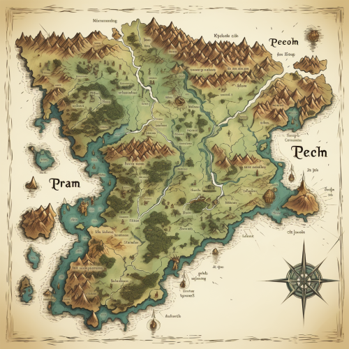 A stylized map of an ancient city, hand-drawn on aged parchment. The map includes winding rivers, narrow streets, and historic buildings, with an ornate compass in the corner. Sepia tones, soft light, subtle shadows. Created using: hand-drawing, Renaissance cartography style, aged paper texture, precise details, vintage iconography, historical accuracy, hd quality, natural look --ar 2:3 --v 6.0