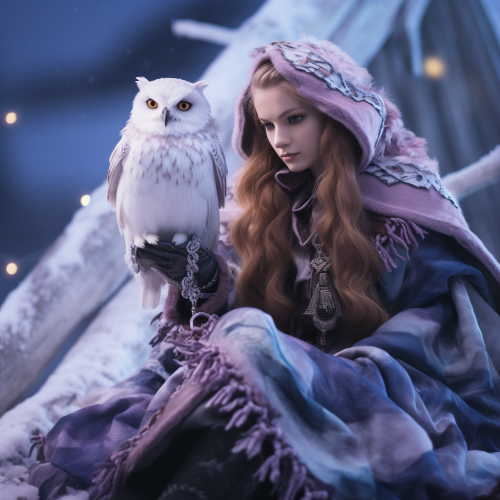 photorealistic. dnd. Small size Druid fairy, purple hair, Fairy wings, warm winter clothes, translucent wings, Transparent wings. sitting next to same size white fluffy owl. Dark Icy world. Snowing background