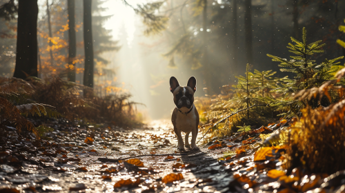 A walk in the forest with a French bulldog with white and black fur, sun beams come through between the trees and it rains --v 6.0 --s 250 --style raw --ar 16:9