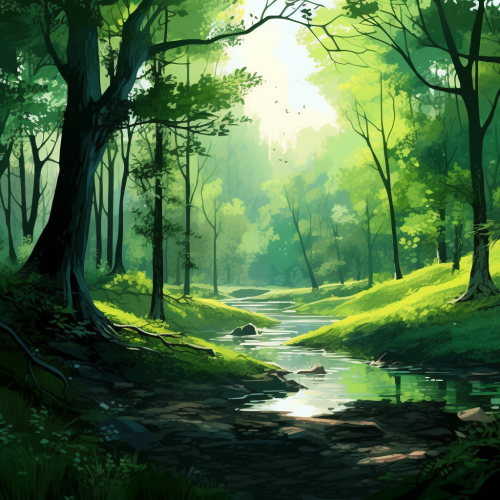 mystical forest glade, dappled sunlight filtering through dense green leaves, vibrant wildflowers dotting the forest floor, a small, clear stream bubbling through the scene, surrounded by ancient trees covered in moss, composition featuring a serene, secluded area, capturing the enchanting and inviting atmosphere of nature, in a style akin to a watercolor illustration, showcasing the beauty of the natural world. --ar 16:9