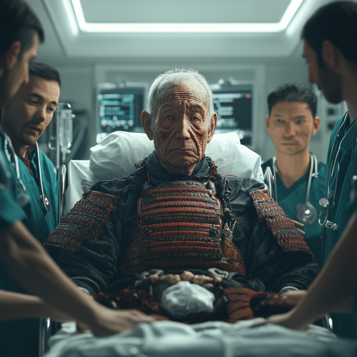 A hyper-realistic and emotionally charged image of a 120-year-old samurai who has just awakened in a modern hospital, surrounded by shocked doctors. The samurai, with deeply lined and weathered skin, is sitting up in a hospital bed, still wearing his traditional, ancient armor, which contrasts sharply with the sterile, modern medical environment. The doctors, dressed in contemporary medical attire, are staring at him in disbelief, their expressions a mix of awe, confusion, and shock at how he is alive. The room is filled with modern medical equipment, and the atmosphere is tense, as if the scene captures a moment of extraordinary historical significance. The image evokes a sense of wonder and the surreal, blending the ancient past with the present in a powerful, emotionally resonant way.