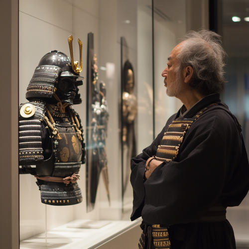 The samurai is in a modern museum, standing in front of a display case containing ancient samurai armor or weapons, much like his own. His expression is one of deep introspection as he looks at the artifacts, perhaps recognizing them from his past. The clean, minimalist design of the museum contrasts with the rich history of the items on display.