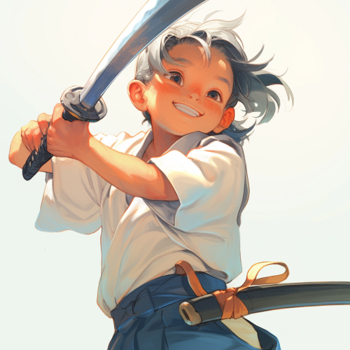 A detailed portrait of Nezu Kojiro from 'The Elusive Samurai,' a young boy with a lean, agile build, and light gray hair styled in twin pigtails. His expression is cheerful, with a mischievous yet innocent smile, reflecting his youthful energy. He wears traditional samurai attire with a sleeveless white tunic and blue hakama, holding a katana confidently. His overall appearance should convey a sense of youthfulness and agility, fitting a young samurai-in-training. The setting should be a vibrant and historically inspired Japanese environment with a natural background, ensuring the character remains the focal point. Emphasize his youthful features, small stature, and the contrast between his cheerful demeanor and the serious world of samurai he inhabits. Avoid depicting him with a muscular or adult-like build; instead, focus on his child-like appearance and spirited personality. --niji 6