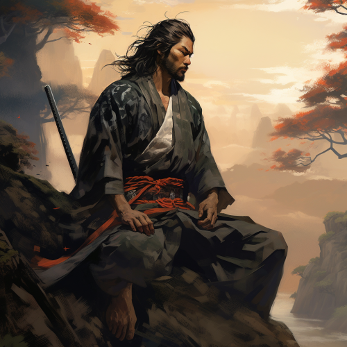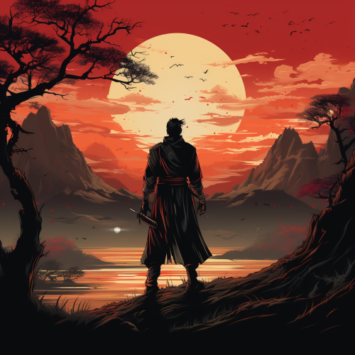 A samurai in an ancient Japanese landscape, facing off against the dragon's head of darkness. The scene is set under a red sun with misty clouds. In the style of art nouveau, with traditional ink painting, Chinese brushwork, and ink wash technique, the artwork features black and gray tones, high resolution, and high detail in a full-body portrait. The dragon's eyes glow darkly. This artwork symbolizes fearlessness amidst danger and mystery, with elements like a castle or village visible behind the samurai. --ar 31:64