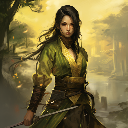 "Envision a scene in an ancient village in feudal Japan from the world of Legend of the Five Rings. Amidst an epic journey, a young 17-year-old samurai shugenja from the Dragon Clan emerges as a striking figure. Her agile and slender figure, standing at a height of 1.63 meters, stands out in the traditional setting. Clad in elegant armor, her posture exudes grace and determination. Her face, serene and focused, reveals wisdom beyond her years. In the Japanese woodblock print, delicate strokes capture the slimness of the character as she expertly wields a ritual staff, symbolizing her prowess as a shugenja. Surrounding her, careful details of the village, such as thatched roofs and cherry blossoms, frame the scene, evoking the unique atmosphere of feudal Japan. The shadow cast by the young warrior adds a touch of mystery to the composition, highlighting her commanding presence as she continues her journey in this world full of legends and challenges."