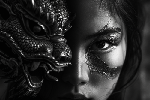 girl and dragon mask, samuray, photorealistc black and white --ar 3:2 --v 6.0