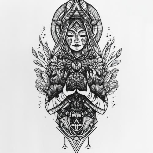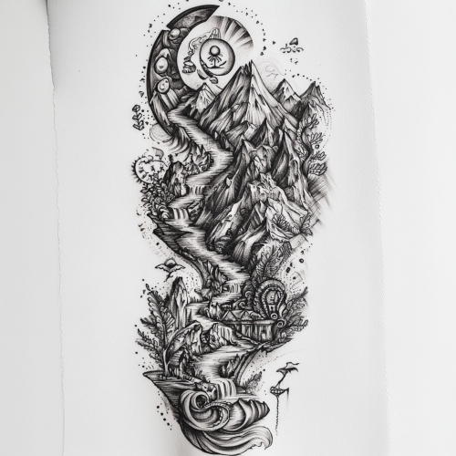 Intricate black and grey tattoo design representing Pachamama, the Andean earth goddess, without a human figure. The design should incorporate natural elements like mountains, rivers, plants, and animals, symbolizing the Earth and fertility. Flowing lines and detailed shading should create a harmonious blend of these elements, with the landscape representing the nurturing and life-giving force of Pachamama. Include symbols of growth, cycles of life, and balance in nature, maintaining a mystical and serene aura