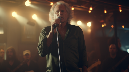 cinematic still of 83 year old Jim Morrison during a live performance, in New York City, medium shot, shot with an Arri Alexa, 500mm lens, f/2.8, Kodak Vision2 500T, natural lighting --ar 16:9 --v 5.2
